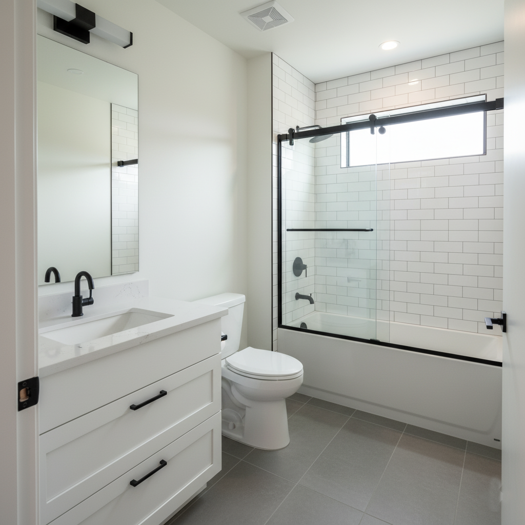 - Features a toilet, a single vanity with storage, and a shower/bathtub combination.