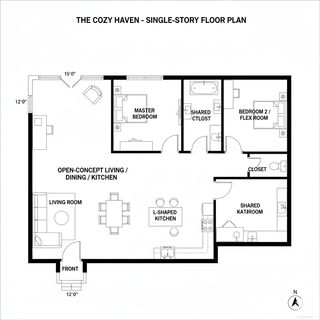 This design is for a compact, single-story house, ideal for a small family or a couple. It emphasizes an open-concept living area, two comfortable bedrooms, and a focus on natural light.